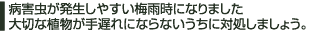 梅雨に入るこの時期は気温も湿度も上昇し、それにともなって病害虫の発生も増えてきます。
