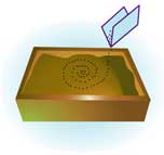 | 6. 2対に折った10cm角のやや固い紙の間にタネを入れ平鉢の上で中から外に向って渦を描くように種を少しずつ落としながら播きます。 |