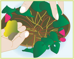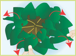 まんべんなく日光が当たるように、図のように葉ぶみをしましょう。