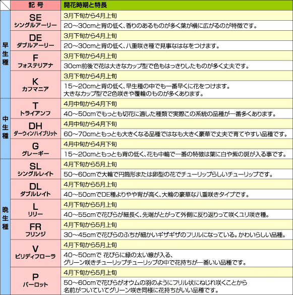 チューリップはこの記号でその大きさ・花の時期などを大まかに分類しています。